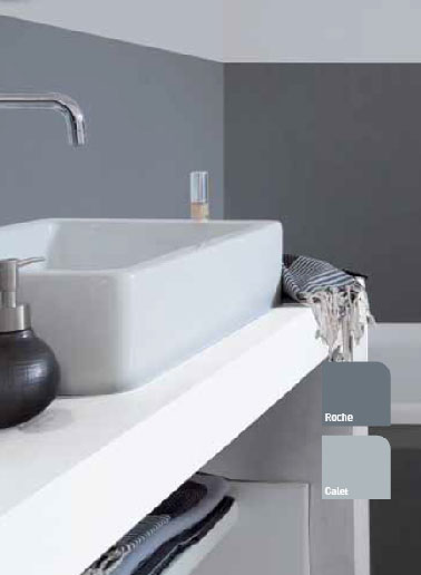 Cette peinture est aussi étanche que du carrelage près des zones de projections d’eau que sont le lavabo et la baignoire. Hydroactiv’ V33 couleur Gris Galet et Gris Roche meuble vasque blanc.