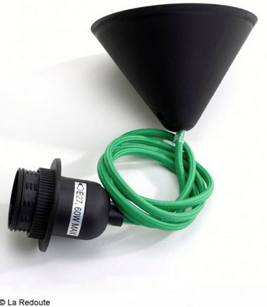 Système cable et douille électrique pour suspension gainé de coton vert émeraudePour une touche discrète de vert descendant du plafond, ou pour faire un rappel de couleur dans la pièce,  un système électrique pour suspension. Cable gainé de coton couleur vert émeraude. Prix : 14.99 € référence : Filaire chez La Redoute.