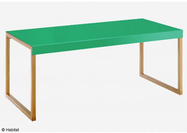 Une table basse aux lignes sobres qui trouvera facilement sa place dans le salon. Matériaux : pieds acier, plateau en chêne massif couleur vert émeraude. Dimensions : l.42 x H.35 x P.85 cm. Prix: 45 € .habitat.fr