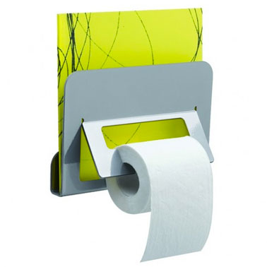 Un dérouleur papier toilette avec porte-revue intégré. Idéal pour gagner de la place dans les toilettes. Existe en trois couleurs : Gris, noir ou blanc