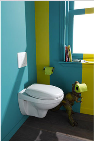 Une déco très tendance pour ces toilettes qui se décline en vert et bleu, les couleurs au top pour cette année. Les wc suspendus avec une cuvette classique blanche, abattant thermodur à frein de chute, volume chasse d’eau 3 et 6 Litres. WC suspendu Théia SENSEA. Prix : 199 € chez Leroy Merlin