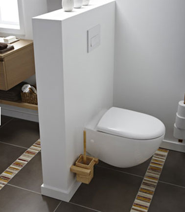 Une solution astucieuse pour conserver de l’intimité à l’espace lorsque les toilettes sont intégrées à la salle de bain. Une mini cloison qui reçoit et dissimule le support bâti.  Bâti autoportant 4 pieds ultra-robuste qui résiste à 400kg. Réglage latéral de l’évacuation la distance mur/siphon est réglable de 15,5cm à 20,5 cm. Cuvette Carénée (design) blanc. 2 Volumes d’eau pour la chasse d’eau : 3 et 6 litres. Prix : 399 € chez Leroy Merlin.